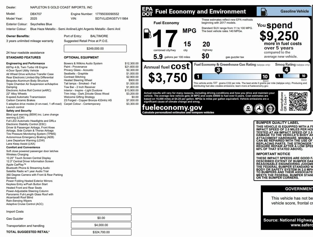 Aston Martin DBX707 finished in Seychelles Blue - the same paint as Prince Charles' Aston Martin DB6. The interior is upholstered from Blue Haze & Light Argento soft-grain leathers featuring contrast stitching & Ziricote Wood interior trim.