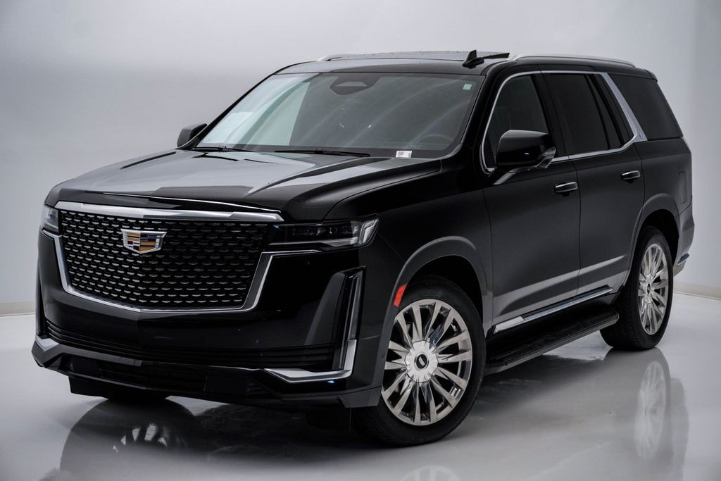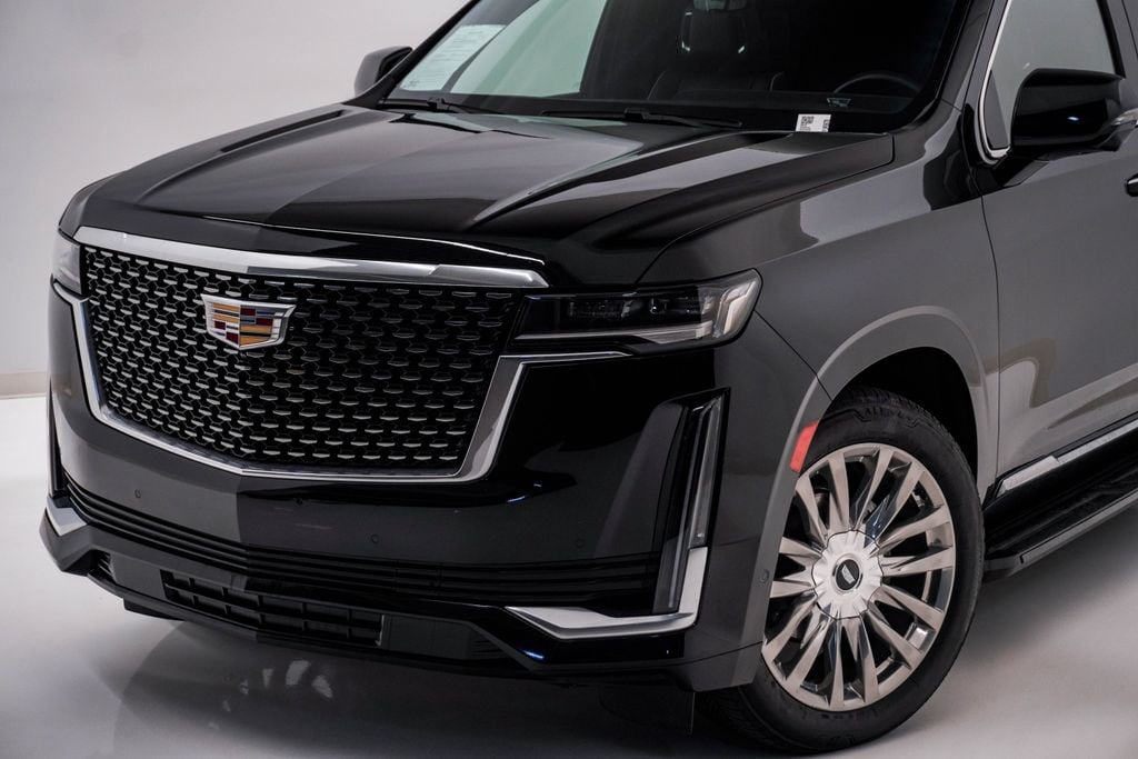 This Escalade is well equipped with All-Weather Floor Liner Package (LPO), Floor Liner Package (LPO) (All-Weather Integrated Cargo Liner (LPO)), Performance Package (Electronic Limited-Slip Differential, Hitch Guidance w/Hitch View, Integrated Trailer Brake Controller, Magnetic Ride Control Suspension, Smart Trailer Integration Indicator, and Trailer Side Blind Zone Alert), Preferred Equipment Group 1SB (Adaptive Cruise Control, AKG Studio 19-Speaker Audio System, Automatic Seat Belt Tightening, Door Lock & Latch Shields, Enhanced Automatic Emergency Braking, Enhanced Automatic Parking Assist, Glass Breakage Sensor, Heated & Ventilated Driver & Front Passenger Seats, Lane Change Alert w/Side Blind Zone Alert, Mechanical Limited-Slip Differential, Power Panoramic Tilt-Sliding Sunroof, Rear Camera Mirror, Rear Camera Mirror Washer, Rear Cross Traffic Alert, Reconfigurable Full-Color Head-Up Display, Reverse Automatic Braking, Running Board Assist Steps, Theft-Deterrent Alarm System, Vehicle Inclination Sensor, and Vehicle Interior Movement Sensor), Touring Package (Air Ride Adaptive Suspension, Illuminating Front & Rear Sill Plates, and Soft Closing Front & Rear Doors), AWD, Black Leather, 16.9" Diagonal OLED Infotainment Screen, 19 Speakers, 2-Presets Memory For Driver Seat Adjuster, 3.23 Axle Ratio, 3rd row seats: split-bench, 4-Way Power Driver Lumbar Seat Adjuster, 4-Way Power Front Passenger Lumbar Seat Adjuster, 4-Wheel Disc Brakes, 8-Way Power Driver Seat Adjuster, 8-Way Power Front Passenger Seat Adjuster, ABS brakes, Air Conditioning, Alloy wheels, AM/FM radio: SiriusXM with 360L, Apple CarPlay/Android Auto, Audio memory, Auto High-beam Headlights, Auto tilt-away steering wheel, Auto-dimming door mirrors, Auto-dimming Rear-View mirror, Automatic temperature control, Brake assist, Bumpers: body-color, Compass, Delay-off headlights, Driver door bin, Driver vanity mirror, Dual front impact airbags, Dual front side impact airbags, Electronic Stability Control, Emergency communication system: OnStar and Cadillac connected services capable, Exterior Parking Camera Rear, Four wheel independent suspension, Front anti-roll bar, Front Bucket Seats, Front Center Armrest w/Storage, Front dual zone A/C, Front reading lights, Fully automatic headlights, Garage door transmitter, HD Radio, Heads-Up Display, Heated door mirrors, Heated Driver & Front Passenger Seats, Heated front seats, Heated rear seats, Heated steering wheel, Illuminated entry, Leather Seating Surfaces w/Mini-Chevron Perf Inserts, Low tire pressure warning, Memory seat, Navigation System, Occupant sensing airbag, Outside temperature display, Overhead airbag, Overhead console, Panic alarm, Passenger door bin, Passenger vanity mirror, Power door mirrors, Power driver seat, Power Liftgate, Power moonroof, Power passenger seat, Power steering, Power windows, Premium Smooth Ride Suspension, Radio data system, Radio: AM/FM w/Navigation, Rain sensing wipers, Rear air conditioning, Rear anti-roll bar, Rear reading lights, Rear Seat Entertainment System, Rear window defroster, Rear window wiper,