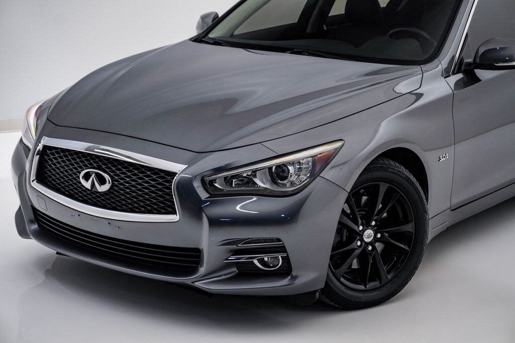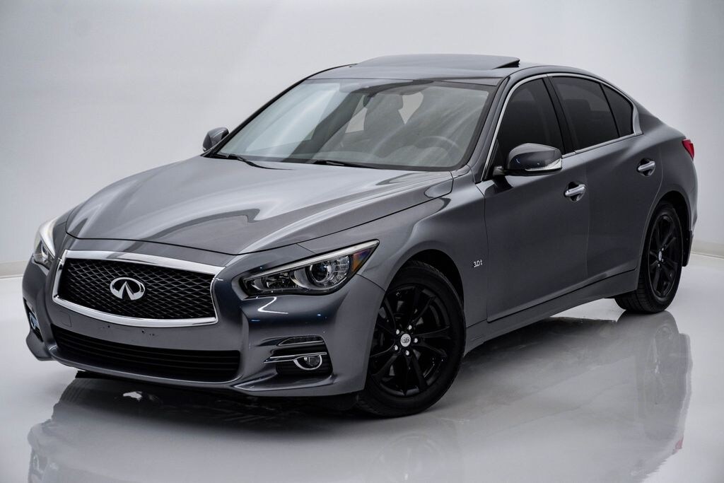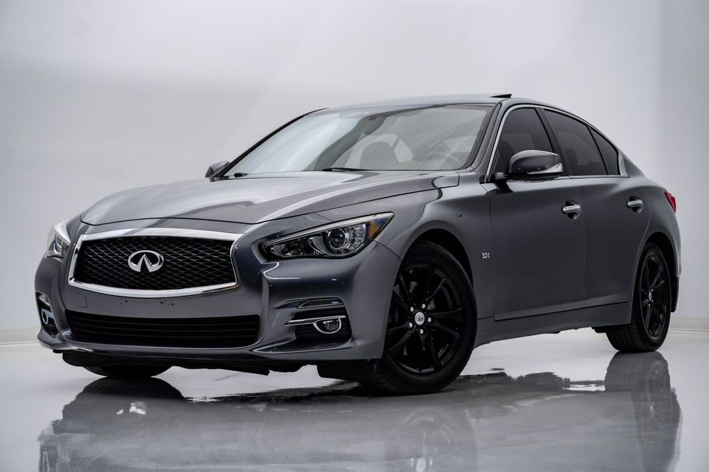This Q50 is well equipped with All Weather Package (L93) (Trunk Protector), Cargo Package (L95) (Carpeted Trunk Mat), 4-Wheel Disc Brakes, 6 Speakers, ABS brakes, Air Conditioning, Alloy wheels, AM/FM radio: SiriusXM, Anti-whiplash front head restraints, Auto-dimming Rear-View mirror, Automatic temperature control, Brake assist, Bumpers: body-color, CD player, Delay-off headlights, Driver door bin, Driver vanity mirror, Dual front impact airbags, Dual front side impact airbags, Electronic Stability Control, Emergency communication system: INFINITI Connection, Four wheel independent suspension, Front anti-roll bar, Front Bucket Seats, Front Center Armrest, Front dual zone A/C, Front fog lights, Front reading lights, Fully automatic headlights, Garage door transmitter: HomeLink, Heated door mirrors, Illuminated entry, Leather Shift Knob, Leather steering wheel, Low tire pressure warning, Navigation System, Occupant sensing airbag, Outside temperature display, Overhead airbag, Overhead console, Panic alarm, Passenger door bin, Passenger vanity mirror, Power door mirrors, Power driver seat, Power moonroof, Power passenger seat, Power steering, Power windows, Premium Leatherette Seating Surfaces, Radio data system, Radio: AM/FM/CD w/MP3 Playback Capability, Rain sensing wipers, Rear anti-roll bar, Rear reading lights, Rear seat center armrest, Rear window defroster, Remote keyless entry, Security system, Speed control, Speed-sensing steering, Speed-Sensitive Wipers, Splash Guards, Split folding rear seat, Steering wheel mounted audio controls, Tachometer, Telescoping steering wheel, Tilt steering wheel, Traction control, Trip computer, Turn signal indicator mirrors, Variably intermittent wipers, and Wheels: 17" Bright Finish Aluminum Alloy.