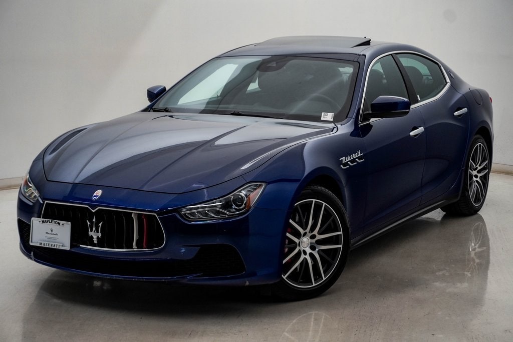 This Ghibli is well equipped with 4-Wheel Disc Brakes, 8 Speakers, 8-Way Power Heated Front Comfort Seats, ABS brakes, Air Conditioning, Alloy wheels, AM/FM radio, Anti-whiplash front head restraints, Apple CarPlay/Android Auto, Auto High-beam Headlights, Auto-dimming door mirrors, Auto-dimming Rear-View mirror, Automatic temperature control, Brake assist, Bumpers: body-color, Compass, Delay-off headlights, Driver door bin, Driver vanity mirror, Dual front impact airbags, Dual front side impact airbags, Electronic Stability Control, Exterior Parking Camera Rear, Four wheel independent suspension, Front anti-roll bar, Front Bucket Seats, Front Center Armrest w/Storage, Front dual zone A/C, Front reading lights, Garage door transmitter, Genuine wood console insert, Genuine wood door panel insert, Headlight cleaning, Heated door mirrors, Heated front seats, High intensity discharge headlights: Bi-Xenon, Illuminated entry, Knee airbag, Leather Shift Knob, Leather steering wheel, Leather Upholstery, Low tire pressure warning, Memory seat, Navigation System, Occupant sensing airbag, Open Pore Radica Wood Trim, Outside temperature display, Overhead airbag, Overhead console, Panic alarm, Passenger door bin, Passenger vanity mirror, Power door mirrors, Power driver seat, Power moonroof, Power passenger seat, Power steering, Power windows, Radio data system, Radio: Maserati Touch Control Plus, Rain sensing wipers, Rear anti-roll bar, Rear fog lights, Rear reading lights, Rear window defroster, Remote keyless entry, Security system, Speed control, Speed-sensing steering, Speed-Sensitive Wipers, Split folding rear seat, Steering wheel memory, Steering wheel mounted audio controls, Tachometer, Telescoping steering wheel, Tilt steering wheel, Traction control, Trip computer, Turn signal indicator mirrors, Variably intermittent wipers, Voltmeter, and Wheels: 19" Poseidone Alloy.
